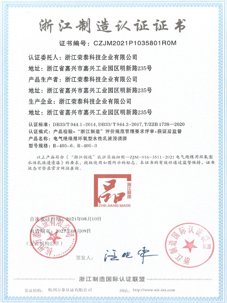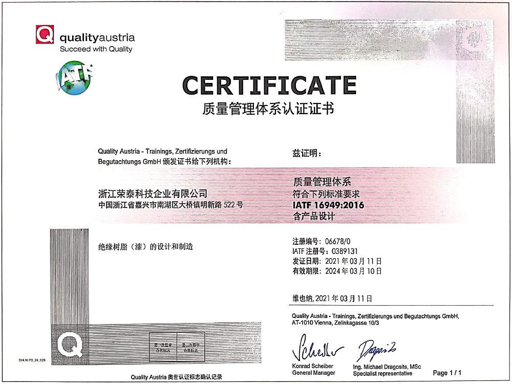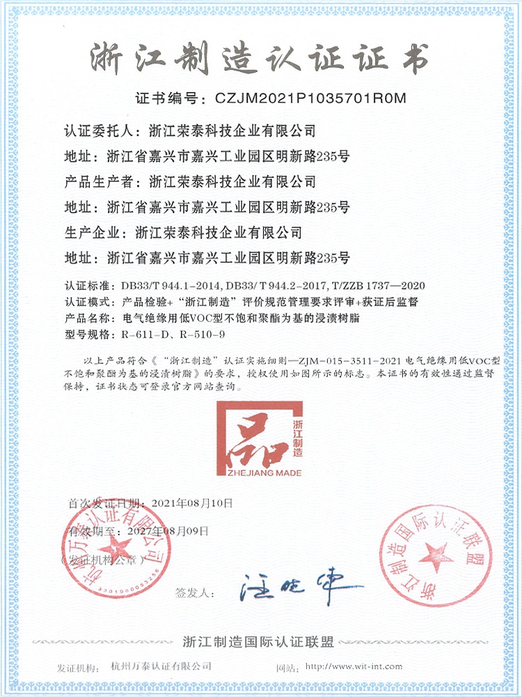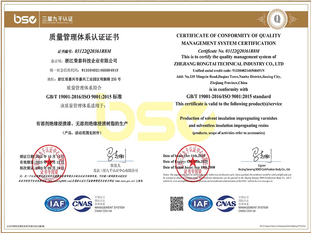 浙江榮泰科技企業(yè)有限公司是一家專業(yè)生產(chǎn)高性能絕緣材料的國(guó)家高新技術(shù)企業(yè)、國(guó)家“小巨人”企業(yè),為國(guó)內(nèi)絕緣漆生產(chǎn)制造領(lǐng)軍企業(yè)、全國(guó)絕緣材料行業(yè)協(xié)會(huì)的副理事長(zhǎng)單位,生產(chǎn)規(guī)模、產(chǎn)品技術(shù)和創(chuàng)新能力處于同行業(yè)領(lǐng)先地位。